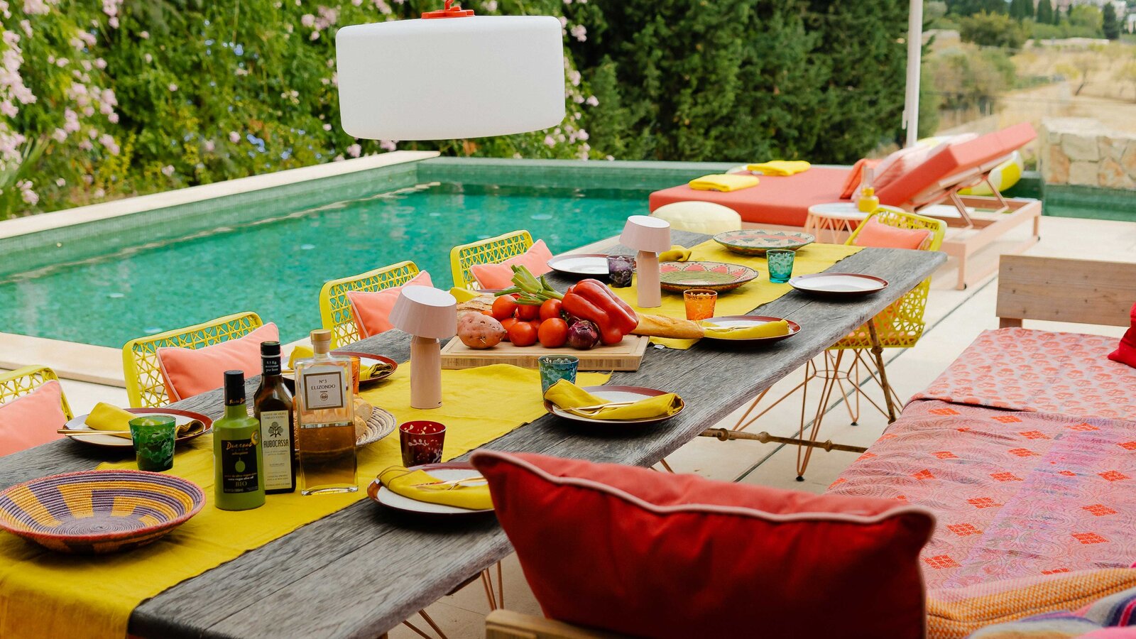 Leja’s designs focus on light, openness and, of course, colour – as the high-quality interior design of the house shows. Bright yellow, rich pink, red, and orange, and various shades of green – inspired by the surrounding Mallorcan nature – shape the character and stand for an carefree attitude towards life. A special feature is the combination of complementary colours such as purple on a yellow carpet or pink and red. These harmonise with each other in the highest luminosity.
