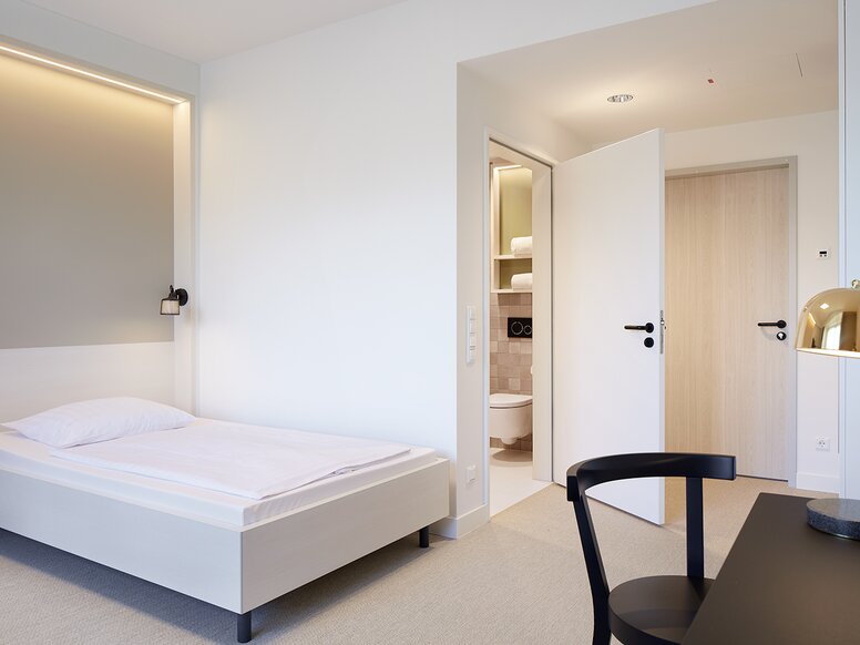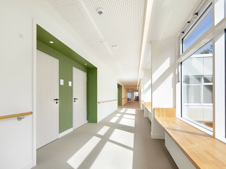 “The treatment concept is geared towards the realities of life and prepares patients specifically for everyday situations,” explains Dr Matthias Wilkening, Managing Partner of Wahrendorff. For example, there are various everyday training locations such as utility rooms and a “launderette”. The architecture of the building, with its skilful combination of indoor and outdoor spaces and a variety of lounges and meeting areas such as terraces, loggias, corridor extensions and group rooms, supports guests' needs for private and sheltered retreats or for social interaction. There are many opportunities here to find your way back into public life at your own pace.