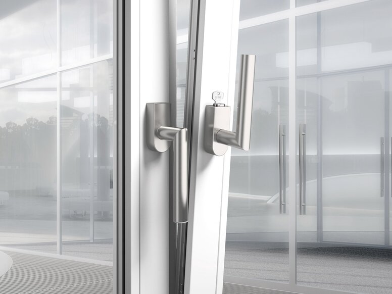 HEWI window handles for locking enable windows to be opened only with a key. In addition, optional lockable window handles with a tilt-before-turn function are available. If the window handle is locked, when turned through 90° it releases the window for tilting. The window leaf cannot be completely opened (turned) in a closed function