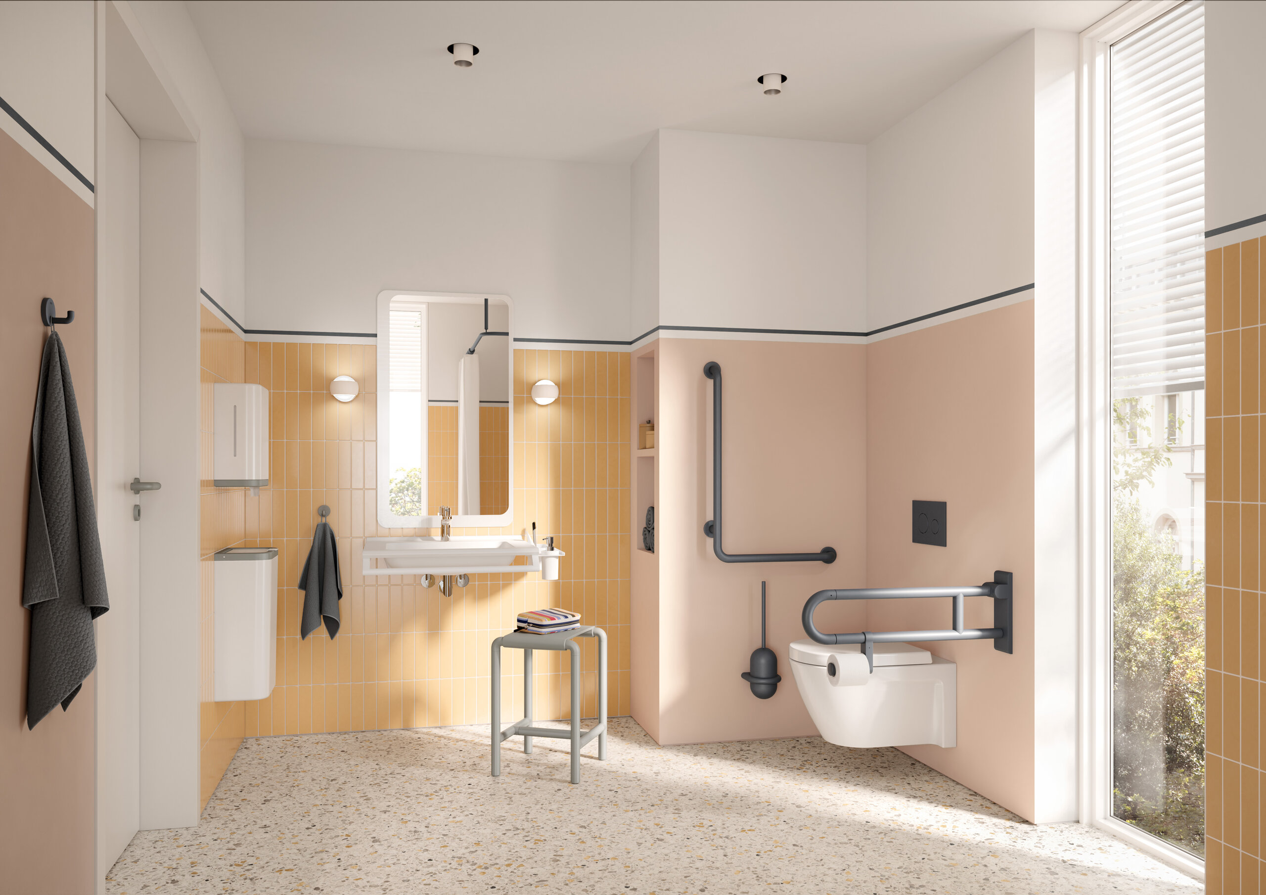 • From washbasins and accessories to fittings, hinged support rails and seats